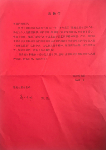 近日,附中收到了一封来自苏州图书馆的“表扬信”,信中对我校金沙高级中学美术班杜佼同学寒假期间的志愿服务活动表示了赞许。